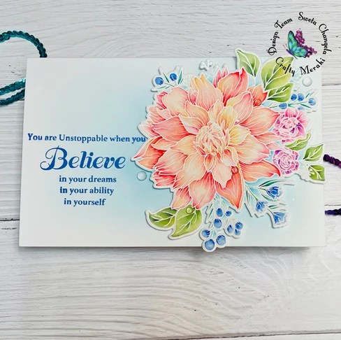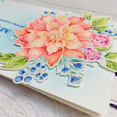 This is a huge floral Believe in Miracles designed by Emily Midgett. I heat embossed the image in pearl from Brutus Monroe, colored with Karin markers, and used the coordinating die to cut it out. The sentiments in this stamp set are quickly becoming my favorites for uplifting and encouraging messages. I made a full-size 5.5 x 8.5 card to do full justice to the wonderful floral design and the stackable sentiments.