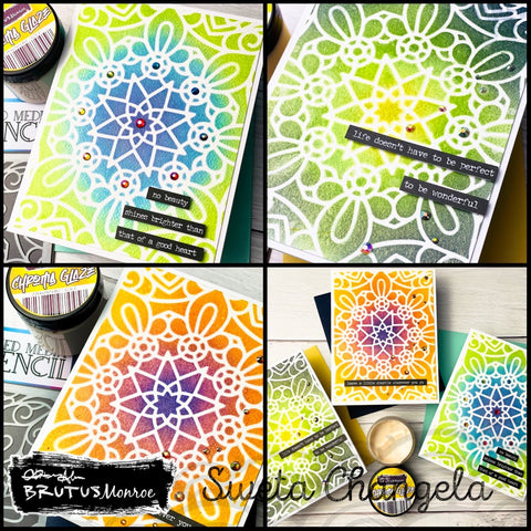 Once done, I took the stencil off and washed it immediately to keep it clean. The glaze layer took about 10 mins to dry completely. I loved this panel so much that I decided to create a couple more !! The effect is so pretty that I did not want to cover up too much of the card. I simply adhered the panels to A2 size card bases, added a few gems for sparkle and simple sentiment strips to finish it off.
