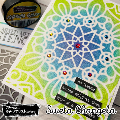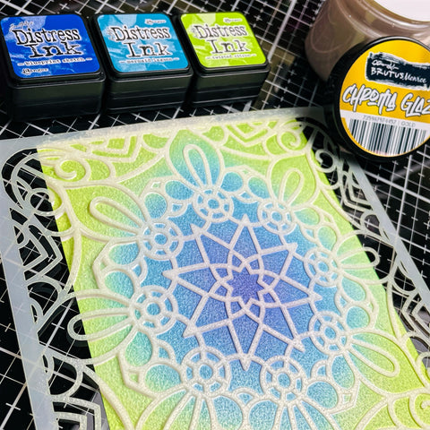 With the stencil still on after ink-blending; I applied the chroma glaze through the stencil with a sponge. Using a sponge created a unique texture as compared to using a palette knife or a spatula which gives a smoother finish.