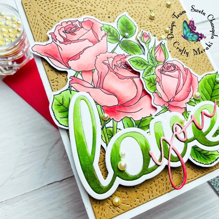 I am playing with the beautiful stamps called Wedding Bouquet and A2 background dies from the new Crafty Meraki #Merakihugs release! I used craft card stock and Dance with me A2 die to create the background with a little bit if black paint splatter. The bouquet was colored with copics and while I had all the copics out I figured it would be interesting to shade the Love word die to match the leaves. I like the effect!