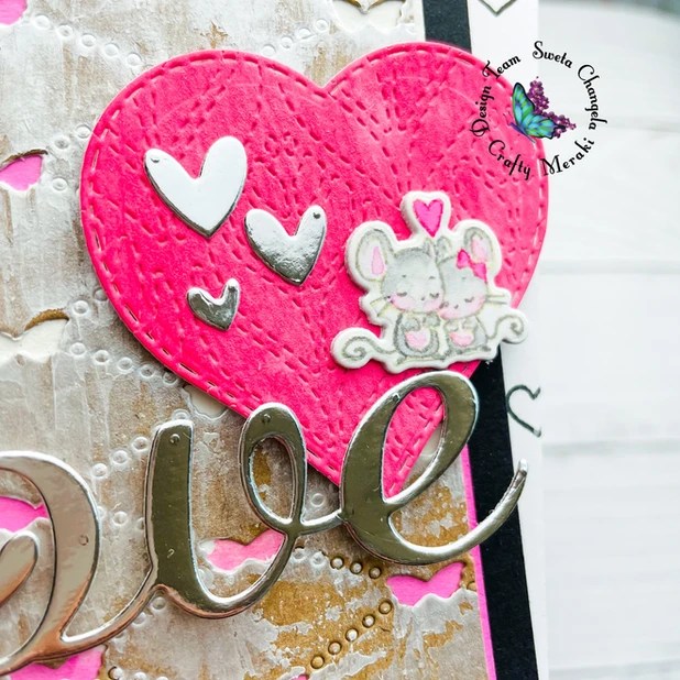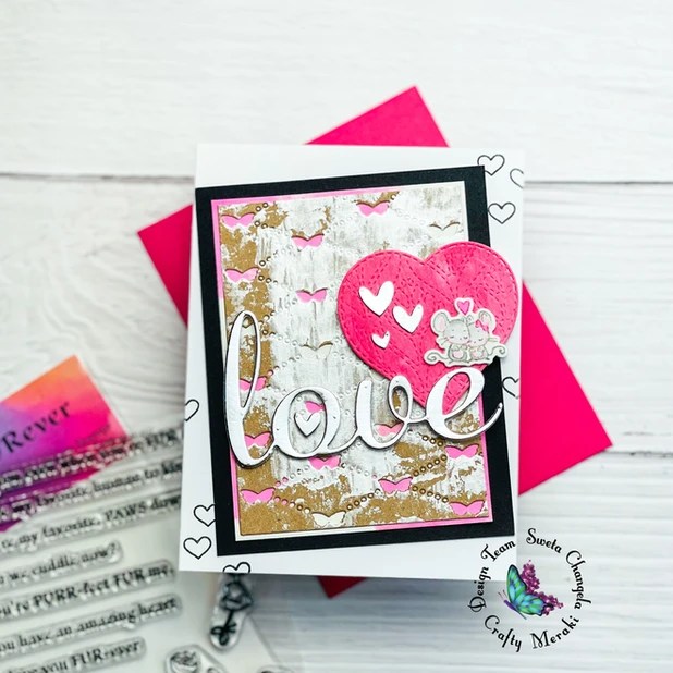 Here I am today sharing this mix media style card on the grid using the cute itty-bitty critters from the Love FURever stamps released by Crafty Meraki. I also used two of the A2 size background dies along with the Love word die from an earlier release. I used some paper glaze from Picket Fence Studios in snowdrop white and a mix of pinks, reds and fuchsia watercolors to create the colors in this card. Critters are colored with zig markers.