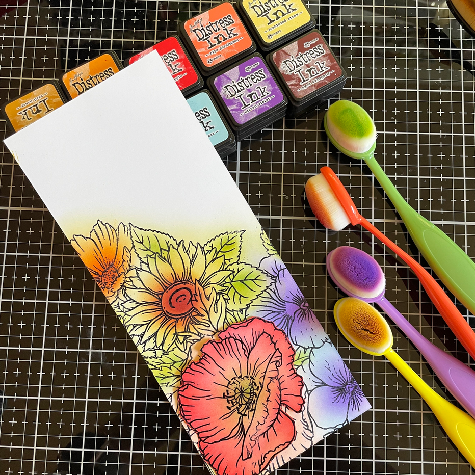 Working on the slimline panel I knew I wanted to do some quick coloring so I took out a bunch of distress inks and blending brushes in various sizes. The idea was to ink blend sections of the floral images. For eg. I used scattered straw to color the sunflower; starting in the center of the flower and radiating outwards adding darker shades and finally some aged mahogany for the center. Use smaller blending brushes when adding color to leaves, flower centers etc.