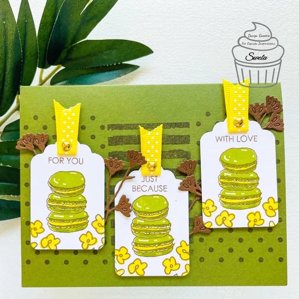 Time for a new challenge at Cupcake Inspirations. It is Jade, Yellow and Brown and we are playing along side our friends at Double Trouble Challenges. For today’s challenge I used an older Altenew set and made three same tags with ink layering images stamped in brown. I do not use colored card bases very often but this one just called for it and the green worked out perfectly for color theme. I used some yellow ribbon from my stash.