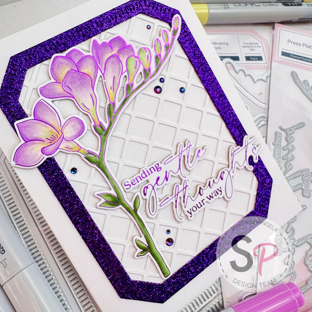 Today’s card uses Freesia Flourish Press Plate and coordinating Die from Pinkfresh Studio. Instead of using the press plate with the BetterPress system, I used it with the Glimmer Machine to foil it and color it with Copics, adding a dash of shimmer and shine to the card. For a full tutorial including info on Copic colors and a bonus tip, head over to the ScrapbookPal Blog.
